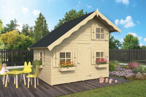 1 053 €Zrubový detský domček so sedlovou strechou, verandičkou a rozmermi 240 x 200 cm. -