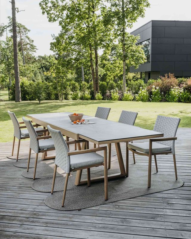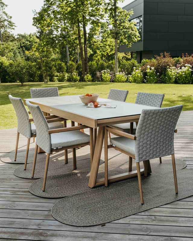 Zostava série Lounge obsahuje rozkladací jedálenský stôl a šesť jedálenských stoličiek.