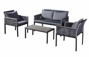 Súprava sa skladá z trojmiestnej pohovky, dvoch kresiel, taburetu, stola a menšieho servírovacieho stolíka. Môžete ju rozložiť do tvaru dlhého rohového sedenia, samostatnej pohovky s dvoma kreslami, či si vytvoriť vonkajšiu posteľ. Maximálne pohodlie sedenia zaručujú pohodlné podušky sivej farby z vysoko kvalitnej textílie Olefin, ktorá je impregnovaná voči plesniam a nečistotám. Všetky podušky majú zipsy, čo umožňuje poťahy podušiek a vankúšov vyprať.