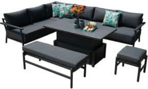 Moderné a multifunkčné záhradné sedenie ocenia najmä majitelia slnečných záhrad či terás. Ponúka priestrannú pohovku, nad ktorou je upevnená polohovateľná tieniaca strieška. Vďaka nej je možné celé sedenie rýchlo a jednoducho zatieniť alebo naopak zložiť dole a užívať si slnečné lúče. Ďalšou výhodou je, že celý set je vysoko variabilný a je možné ho prestavať tak, ako práve potrebujete.