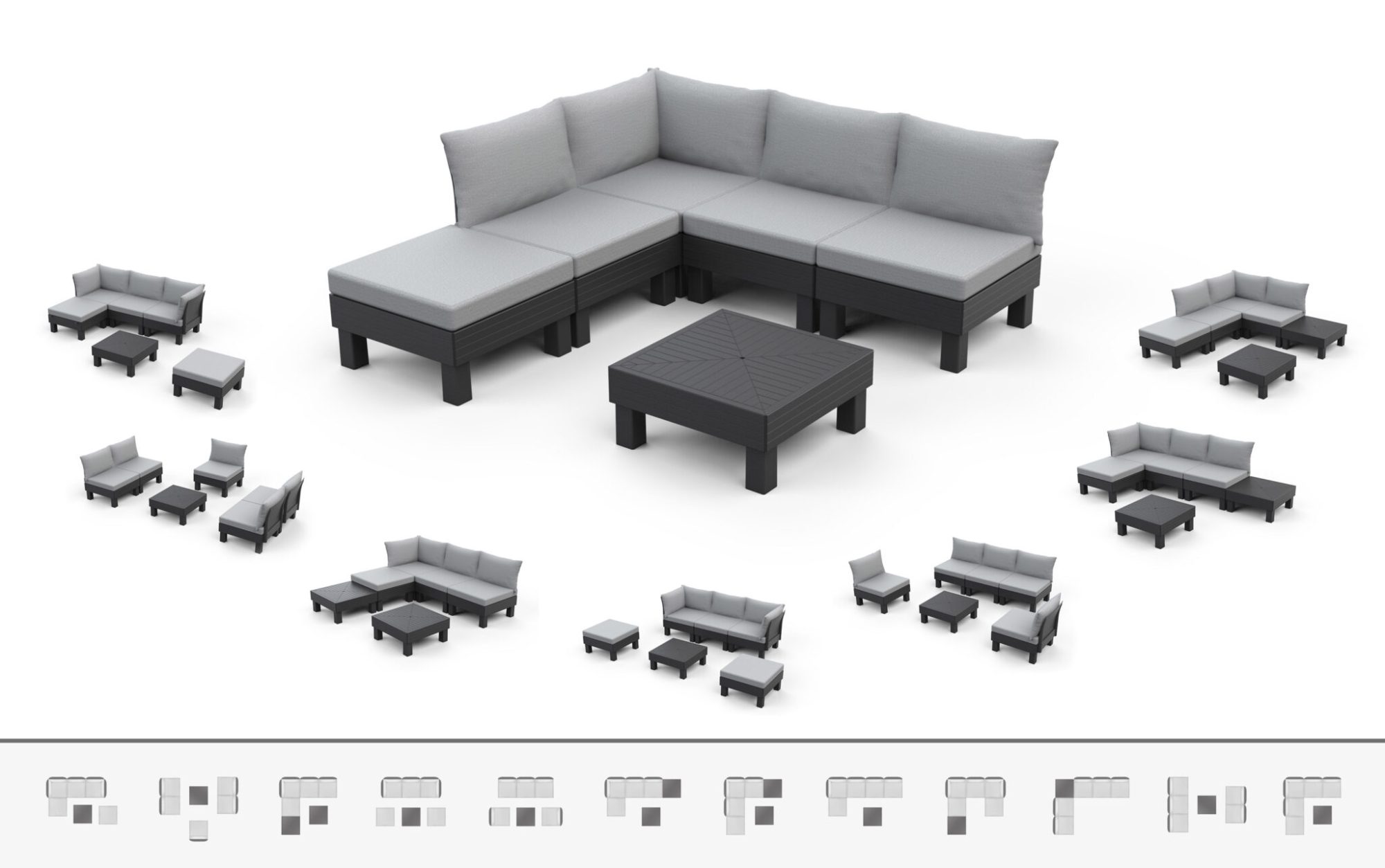 Modulárny set vám poskytne veľké množstvo spôsobov, ako nábytok zostaviť. Záleží na vašich možnostiach a predstavivosti. Počas chvíle zmeníte rozmiestnenie operadiel alebo základov s nožičkami. Vytvoríte samostatné kresielka, 5-miestnu sedačku alebo jeden zo základov využijete ako odkladací stolík.